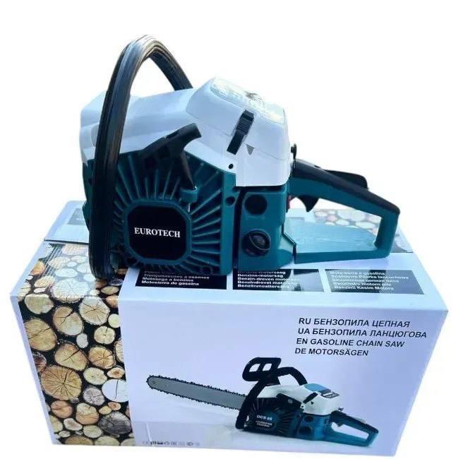 Бензопила EUROTECH - надійна бензинова пила напівпрофесійного класу. Ця модель має досить велику потужність, щоб впорається з будь-якими завданнями з розпилювання деревини. За допомогою цієї бензинової пили можна розпиляти товсті колоди, заготовити дрова на зиму, розчистити ділянку, також її часто використовують у дерев'яному будівництві. Пилою можна працювати тривалий час завдяки її хорошій системі охолодження, також слід зазначити, що ця модель дуже економічна і споживає зовсім небагато палива, завдяки цьому паливного бака вистачає на тривалий час.